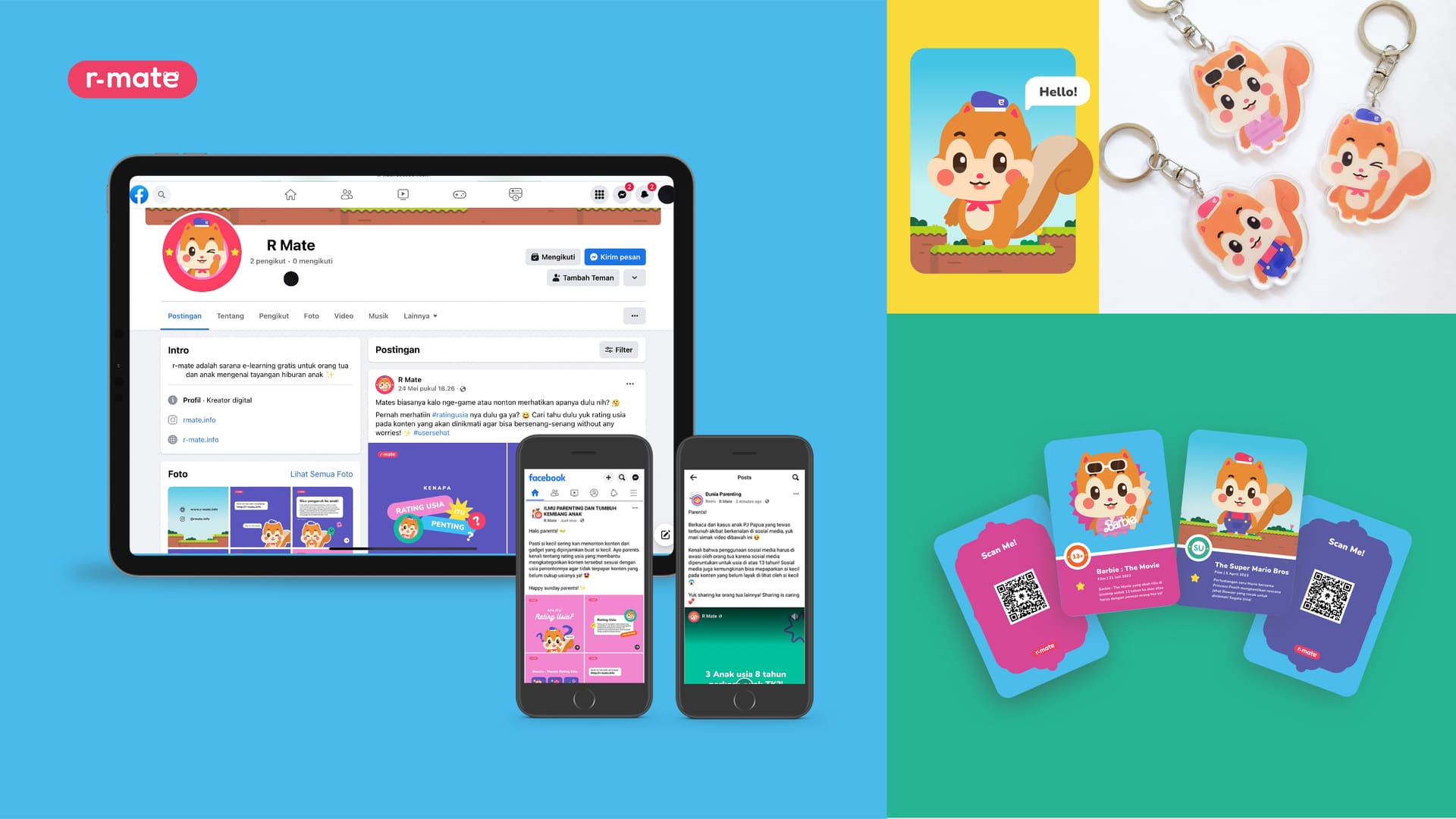 r-mate stands for 'rating mate', hoping that r-mate is a thing that can be a guiding mate to learning about age rating. r-mate itself has a mascot to deliver the message named Rad which is a smarty squirrel that helps you to explore the age rating through r-mate. Our goals are to raise awareness about age rating, especially for career moms who are super busy with media that they are familiar with and also easy to access with a game alike visual.